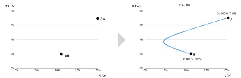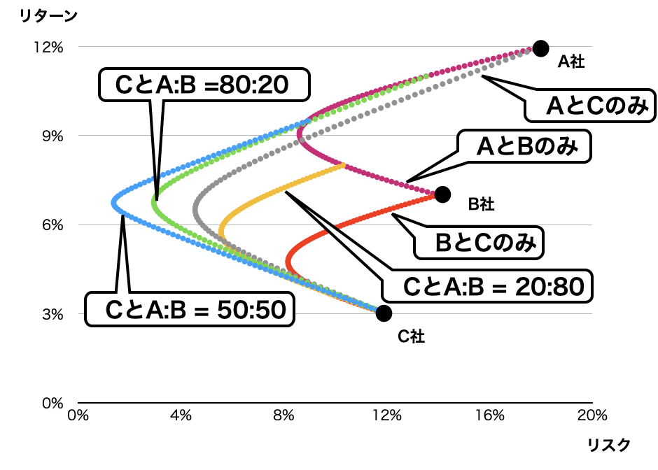 3銘柄になると変数が多くなるので、例えばA:B = 50 : 50のポートフォリオを一つの銘柄と考えて、Cとこの銘柄の2銘柄ポートフォリオの曲線を描く、ということをしています。